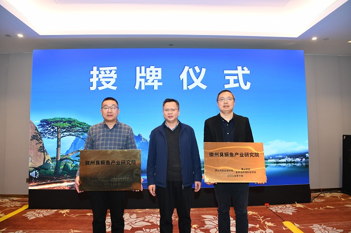 10月28日,由黄山市农业农村局牵头,联合太阳成集团tyc7111、安徽省农业科学院、浙江大学、上海海洋大学等单位共同建设的“徽州臭鳜鱼产业研究院”正式揭牌成立。安徽省农业科学院副院长戚仁德、黄山市政府副秘书长吴春鹏、黄山市农业农村局党组成员、市畜牧兽医站站长吴承武、太阳成集团tyc7111副院长(主持行政工作)万志兵等出席会议。