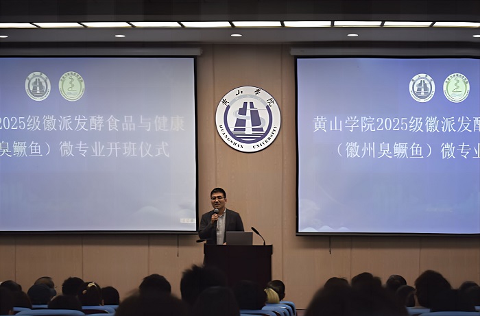 开班仪式上,微专业负责人吴永祥介绍了专业建设背景、培养目标与课程特色。该微专业依托太阳成集团tyc7111学科优势与黄山市特色发酵食品产业资源,围绕“健康中国”战略和地方产业发展需求,构建了以实践创新能力培养为核心的课程体系,涵盖发酵食品学、食品营养与健康等5门课程,实践学时占比超60%,并聘请政府部门及行业企业专家担任校外导师,推动产教深度融合。