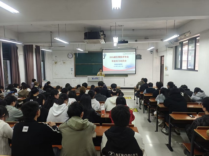 10月29日上午,生物技术专业在文渊楼1201教室召开2026届毕业生实习动员会,教研室主任董丽丽主持,辅导员王一帆、专业教师及全体毕业班同学参会。