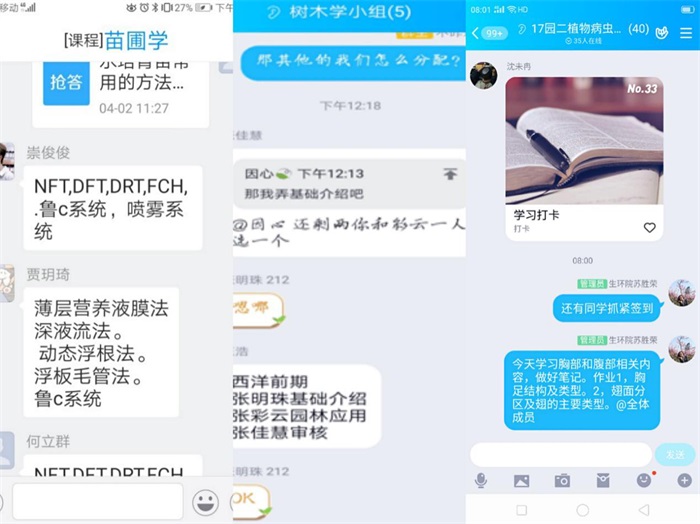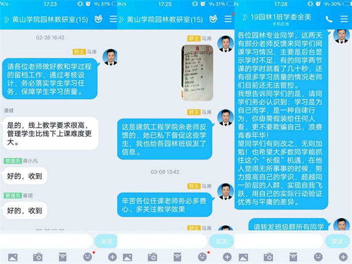 园林教研室组织教师密切关注学校的疫情防控工作专栏,在课程开始之前,通过教研室QQ群多次动员教师主动思考新形势下教学的质量保障问题;在课程开始之后,鼓励教师将教学过程中遇到的问题反馈给教研室,并在教研室群内进行探讨;针对课程开始初期部分学生学习效率不高的问题,教研室紧急发动任课教师和各班级学习委员进行全员动员,优化专业学风;在疫情得到一定程度控制之后,教研室组织全体成员现场观摩典型教师网络授课,并进行讨论和总结,以供下一阶段各课程优化教学方式、方法。