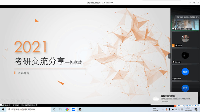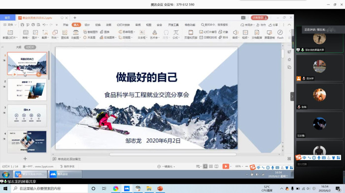 本次疫情下的云交流会通过腾讯会议网络平台进行了线上经验分享。张影介绍了疫情防控常态化下的安全就业、考研形势以及学院2020年考研现状,并表示学院会尽最大努力全力服务2017级考研与就业的学生。交流会上,优秀的考研学生代表和实习生代表分别从考研学校选择、复习方法、考研心态、复试与调剂、实习与就业等方面敞开心扉,与学弟学妹们畅谈亲身经历。考取南昌大学食品科学与工程专业的汪志强同学表示,复习考研是一场持久战,需要坚定的信念、周密的学习计划和坚持不懈的毅力,要结合自己的实际情况选择考研学校,要客观分析自身优势,量力而行,切不可盲目选择,好高骛远。工作于合肥伊利乳业有限责任公司的邹志龙同学讲述了自己实习与就业的完整过程,以及笔试、面试等求职中的注意事项,鼓励大家要致知于行,为将来的就业积累经验。活动过程中,同学们认真聆听并积极发言提问,现场气氛十分活跃。最后,吴永祥对2020届食品科学与工程专业考研和就业学生取得的优异成绩给予了高度肯定和祝贺,并告诫同学们要提前做好准备,充分利用大学美好时光,进一步提高专业水平和实践能力。