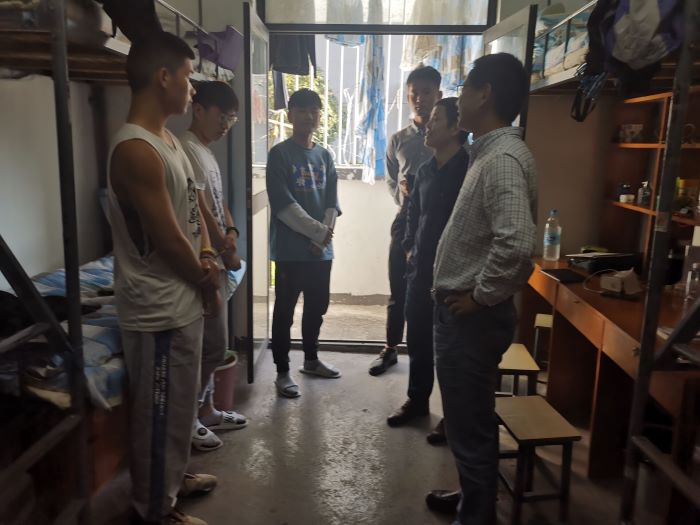 10日下午,该院党政领导及新生辅导员走访各专业的新生宿舍。“你们来自哪里?”、“通过什么方式来的学校?”、“喜欢什么样的运动?”几句简短的问候使院领导与新生迅速打成一片,他们详细询问新生到校后的住宿、就餐等方方面面的情况,并提醒同学们在平常的生活中,务必注意财物安全、用电安全、人身安全,保持宿舍卫生、加强内务整理。