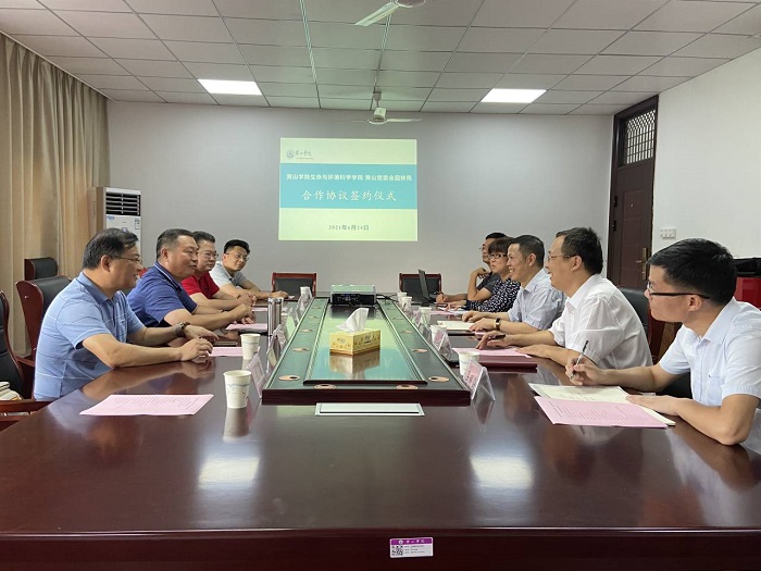 2021年6月24日,黄山管委会园林局局长杨新虎、总工程师姚剑飞、办公室主任王昭成、资源保护管理科科长吴俊来我院签署生物多样性保护合作框架协议。院长佘新松、党委副书记万志兵、生物技术教研室主任胡晓倩、环境科学教研室主任马明海、生物科学教研室主任李伟参加会议。会议由万志兵主持。