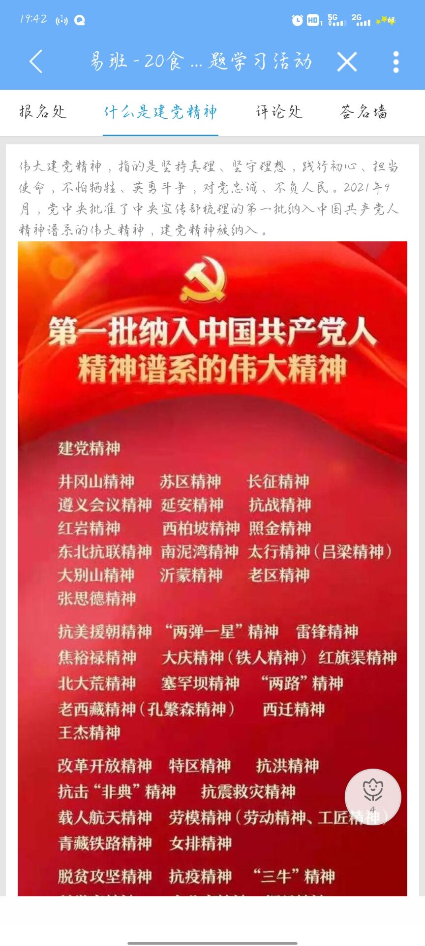 为切实做好易班网络文化月活动,落实学院党史学习教育工作,11月9日-11日,20食品班利用易班平台举办了党史学习教育暨学习伟大建党精神主题活动。该班全体73名同学参加活动。