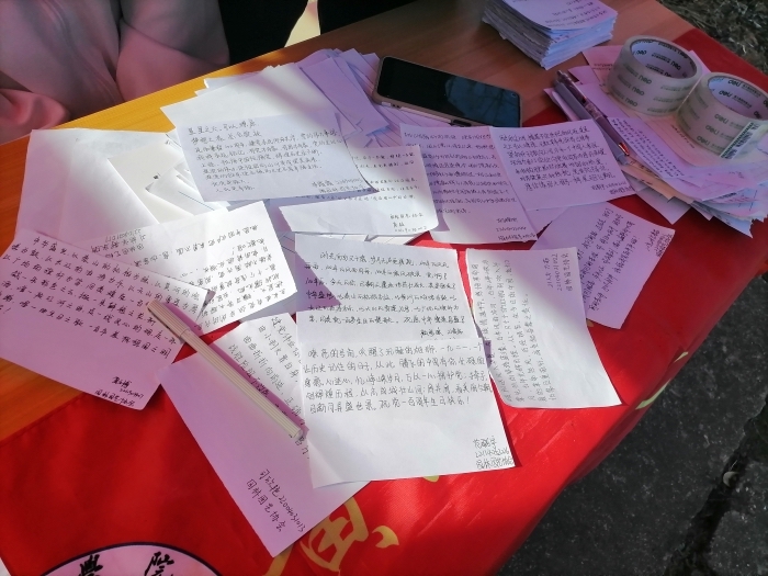 活动伊始,工作人员在一食堂前设立展台,收集同学们写着关于百年党史感想和理解的纸条。随后,工作人员挑选出优异的作品与准备好的鲜花一同粘贴于校园各处,供同学们摘取阅览。活动期间,指导老师马涛到达现场,对园林园艺协会的工作进行指导并提出要求。