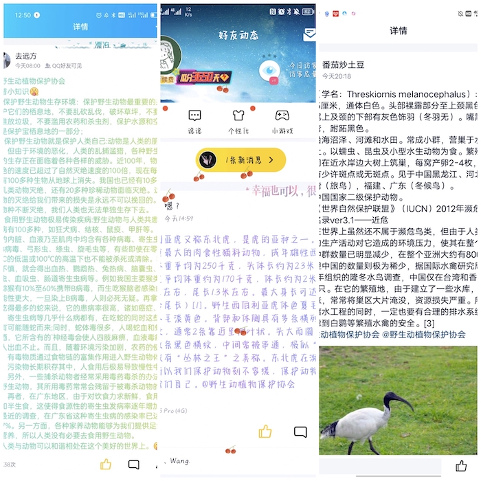 活动伊始,参与者查找关于动物保护的相关知识,进行总结概括后将其发布在QQ空间作为科普小知识,然后将空间截图通过邮箱发送给活动组织者。活动结束后,组织者对上交的截图进行整理,也从截图中了解到许多动物保护小知识。