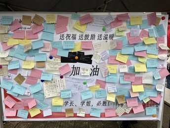 活动二为于一食堂对面搭建“考研加油站”,同学们写下自己对学长学姐的温馨话语并粘贴在考研祝福展墙上。祝福墙上,同学们用最简单、最真诚的语言向毕业班同学送去了最真诚的祝福与关心:有祝福考研学子金榜题名、蟾宫折桂的,有叮嘱学长学姐按时休息、注意身体的。