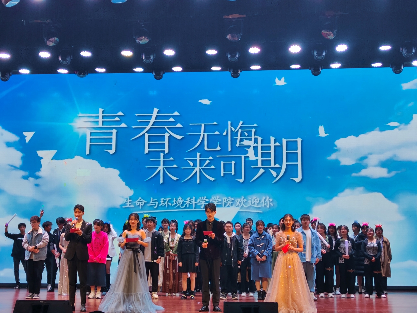 歌曲《这世界那么多人》深情温润给观众带来了美妙的体验;诙谐幽默的小品《铃儿响叮当》给观众带来了欢声笑语;轻盈曼妙的民舞《烟雨行舟》成就了一场清新美丽的中国风表演;韩舞《What is love》嗨爆全场;模特走秀给观众带来了视觉盛宴,将全场气氛推向了高潮;配音给观众带来了听觉盛宴,引得现场惊叫连连;小品《我叫安德烈》让观众感受到战争的残酷,发人深思;之后,生环学院教师用一段段动听的歌声和学生们一起欢度这美好的时光;朗诵《秋瑾》传递出巾帼英雄秋瑾对天下孩子的炽热的爱;最后,一首合唱《相亲相爱》为本场晚会划上了圆满的句号。