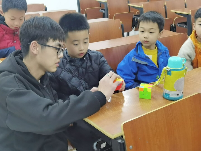 此次活动由会长主持,会长先对活动进行了简单的介绍,并将教职工子女们进行分组,随后理事成员对参加活动的小朋友们进行魔方教学。为了让每个小朋友都能有参与感,每个理事成员都有足够的时间进行教学,活动采用一对二的教学模式。主要教学内容为二阶魔方的还原,在此次活动中小朋友们积极学习并进行实践。活动最后,小朋友们学到许多魔方技巧,理事成员们也积累了一定的教学经验。