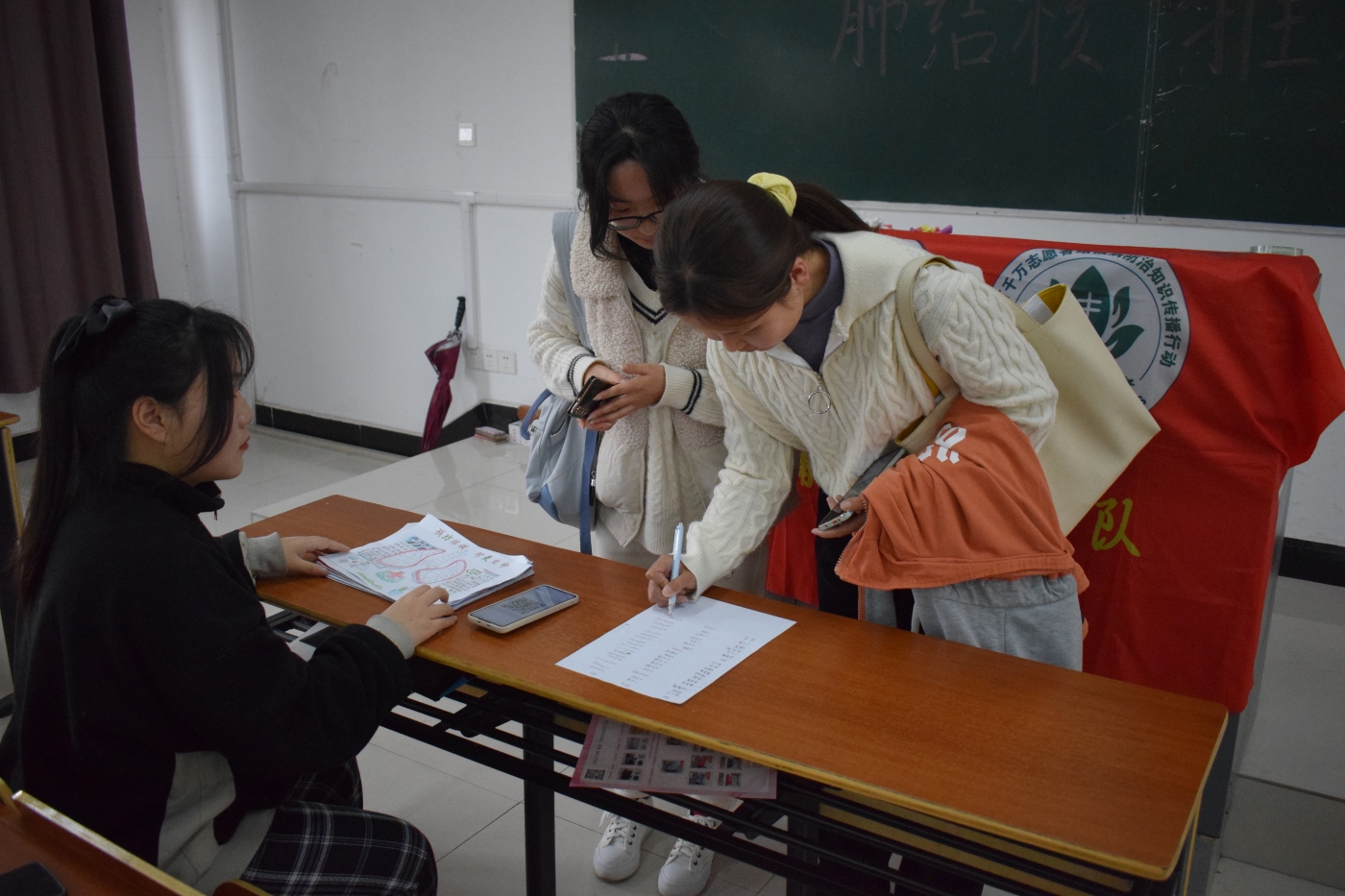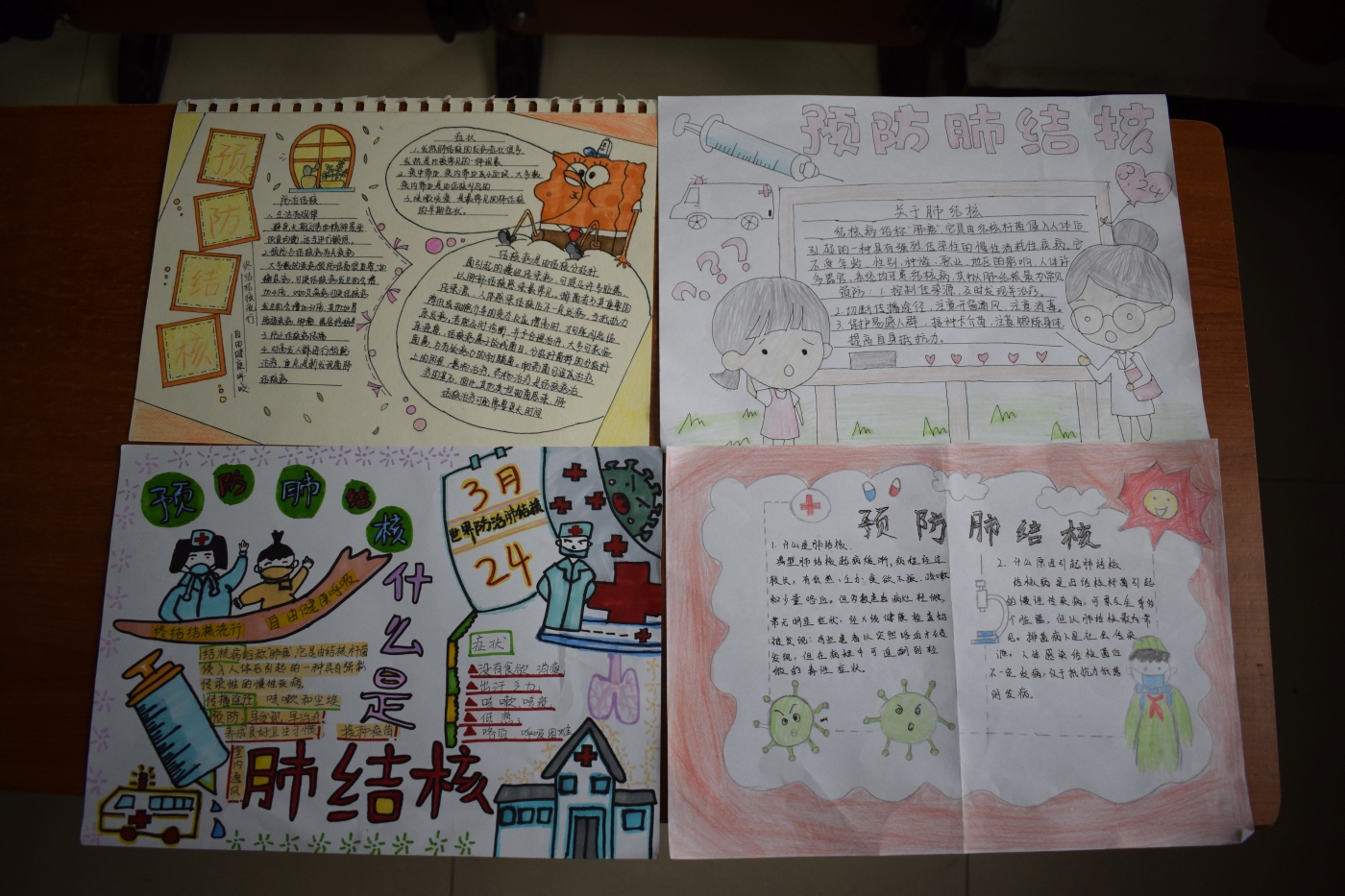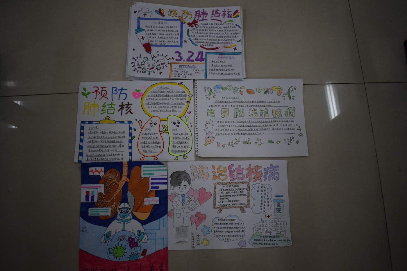 活动开始前,工作人员准备画有防治肺结核知识的展板,以便同学们观看学习。同学们利用课余时间学习结核病知识并绘画手抄报。活动开始后,同学们来到活动地点签到、观看知识展板、提交手抄报。在此次活动中,同学们有序地将作品交给工作人员,工作人员对作品进行收集、评比。活动最后,工作人员向优秀作品的参与者发放奖品。