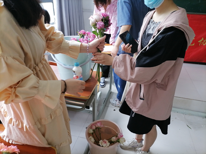 活动开始前,同学们扫码进群,在群里积极组队。活动开始,社团理事分发鲜花、花泥等插花材料,参与者带好口罩有序领取。活动当晚,组织部上传插花教学视频,供大家参考学习,同学们发挥自己的想象进行创作。后期参与者将插花作品的照片附上对建团100周年的祝福发布动态,并截图上传至群相册。活动结束,教师马涛和工作人员从中挑选出优秀的插花作品,进行作品评比,选出一、二、三等奖,并向获奖的学生发放奖品和相应学分。