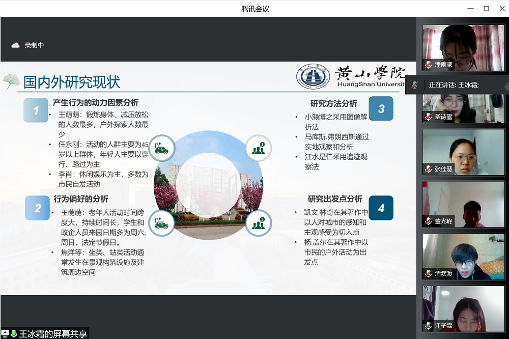 答辩正式开始前,各答辩组长针对本次答辩从汇报时间、汇报重点、问答流程等方面向同学们提出具体的规范要求。答辩过程中,以论文形式开展毕业课题的同学,重点就各自课题的研究背景、研究重点、研究方法、研究内容、研究结论与讨论等方面进行了汇报;以设计形式开展毕业课题的同学,重点就各自课题的项目背景、项目重点、案例分析、总体规划、详细设计、动画效果等方面进行了汇报和展示。每位同学汇报结束后,各答辩组教师均与同学进行了两个以上问题的问答互动。整场答辩结束后,各答辩组根据园林教研室针对本次答辩工作的具体要求,将答辩学生的成绩予以公布,并通知后续成果修改与提交的具体要求。