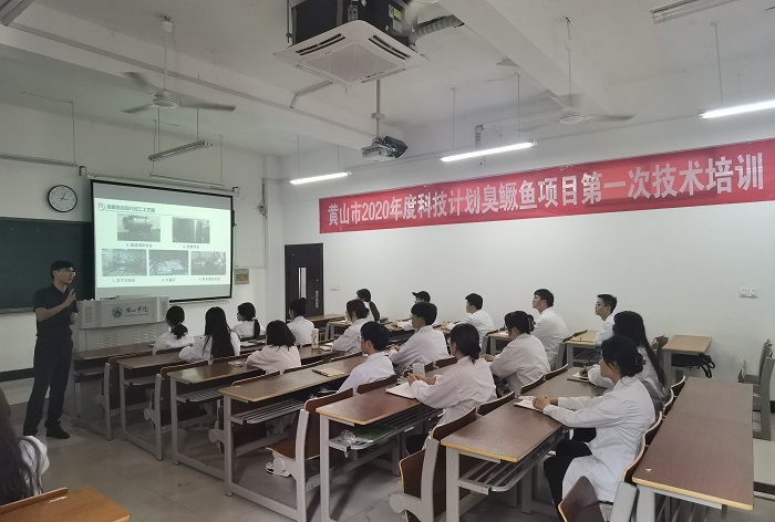 2022年7月11日,太阳成集团tyc7111吴永祥、吴丽萍、陈飞、张蒙等4位食品专业教师在太阳成集团tyc7111文端楼2102教室,结合黄山市科技计划项目《黄山臭鳜鱼品质控制关键技术研究及其副产物高值化综合利用开发》的实施,对黄山市胡兴堂桃花流水食品有限公司、黄山市超港食品有限公司、黄山市宴仙食品有限公司等技术人员20余人开展了臭鳜鱼加工技术的培训。