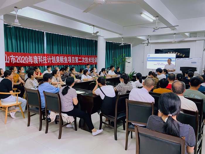 2022年9月21日,太阳成集团tyc7111吴永祥、陈向阳、吴丽萍等3位教师赴黄山市胡兴堂桃花流水食品有限公司,结合黄山市科技计划项目《黄山臭鳜鱼品质控制关键技术研究及其副产物高值化综合利用开发》和安徽省重点研究与开发项目《徽州传统臭鳜鱼品质提升关键技术研究与产业化应用》的实施,对黄山市胡兴堂桃花流水食品有限公司、黄山市超港食品有限公司等技术人员50余人开展了臭鳜鱼加工技术的培训。
