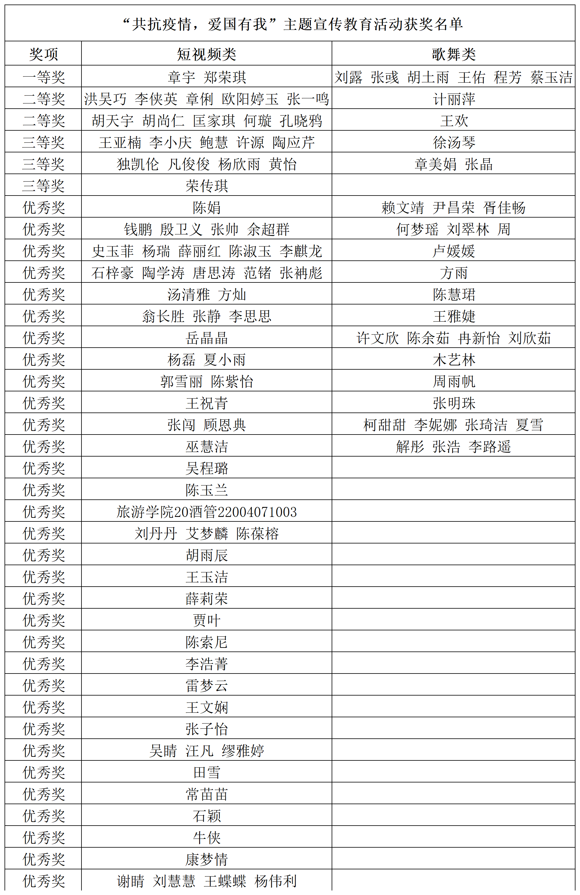 活动围绕伟大抗疫精神、抗击疫情事件、抗击疫情英雄人物、抗击疫情志愿者、抗击疫情纪录片共5个主题开展,鼓励校园学生通过歌曲、舞蹈等宣传“共抗疫情,爱国有我”。活动共收到作品134余件,作品充分体现了当代大学生抗击疫情的担当作为,弘扬了新时代爱国主义精神。
