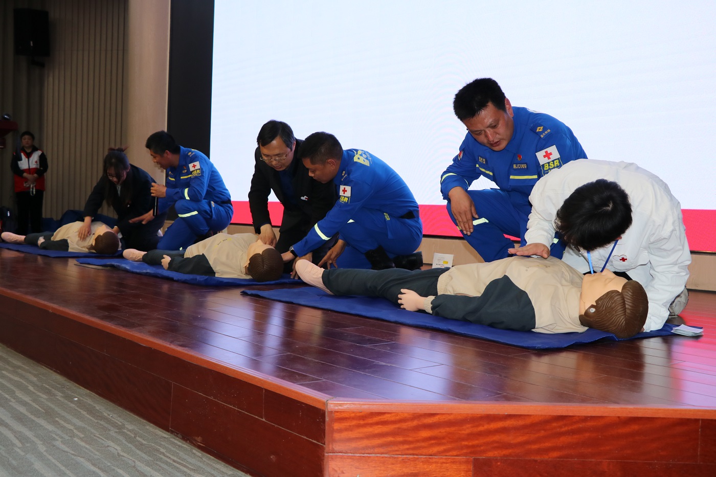 培训中,区红十字应急救护培训讲师团队采取理论与实操相结合的方式,让参训学生深入了解现代救护概念、心肺复苏、海姆立克急救法等救护知识与技能。借助模拟人,演示心肺复苏各环节的操作步骤和要点,并安排学生现场操作,一对一进行指导,力争让每一个动作做到准确、规范、到位,让学生们全方位掌握应急救护知识和技能。