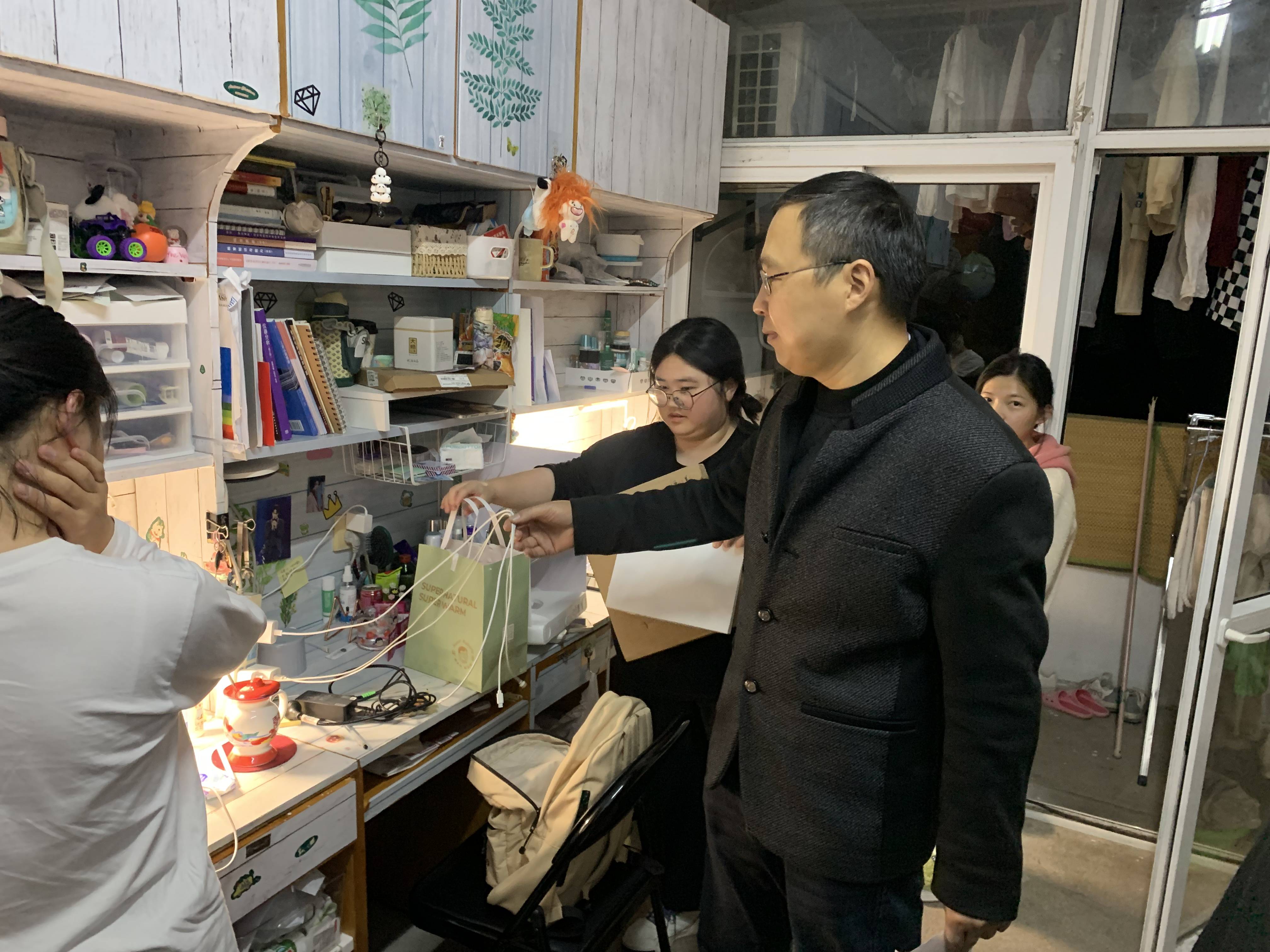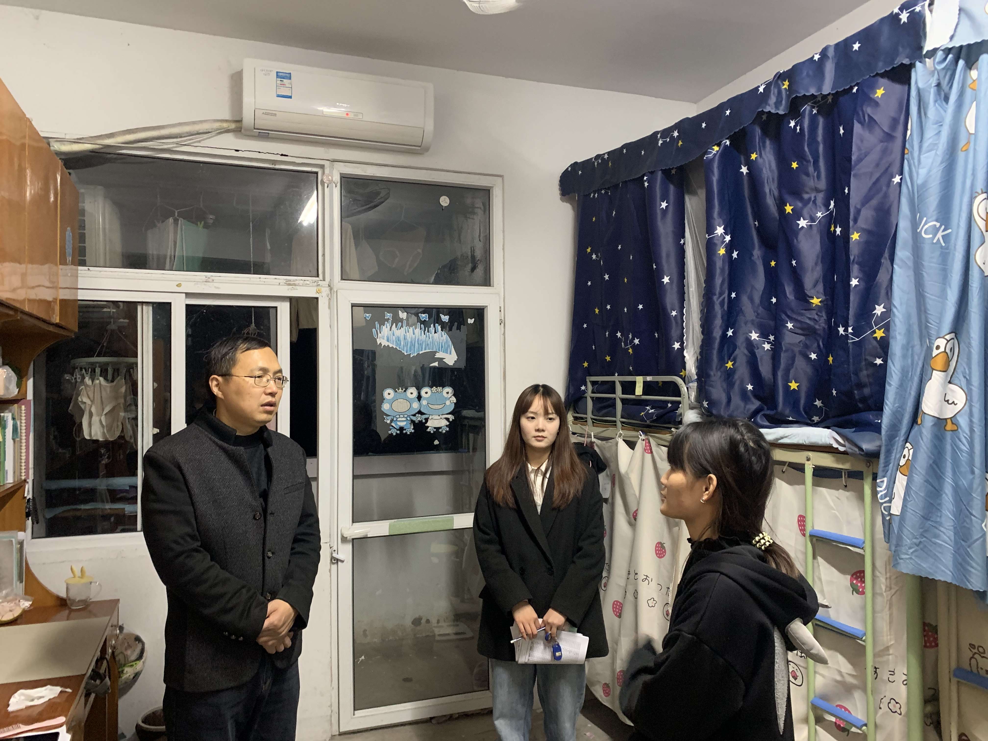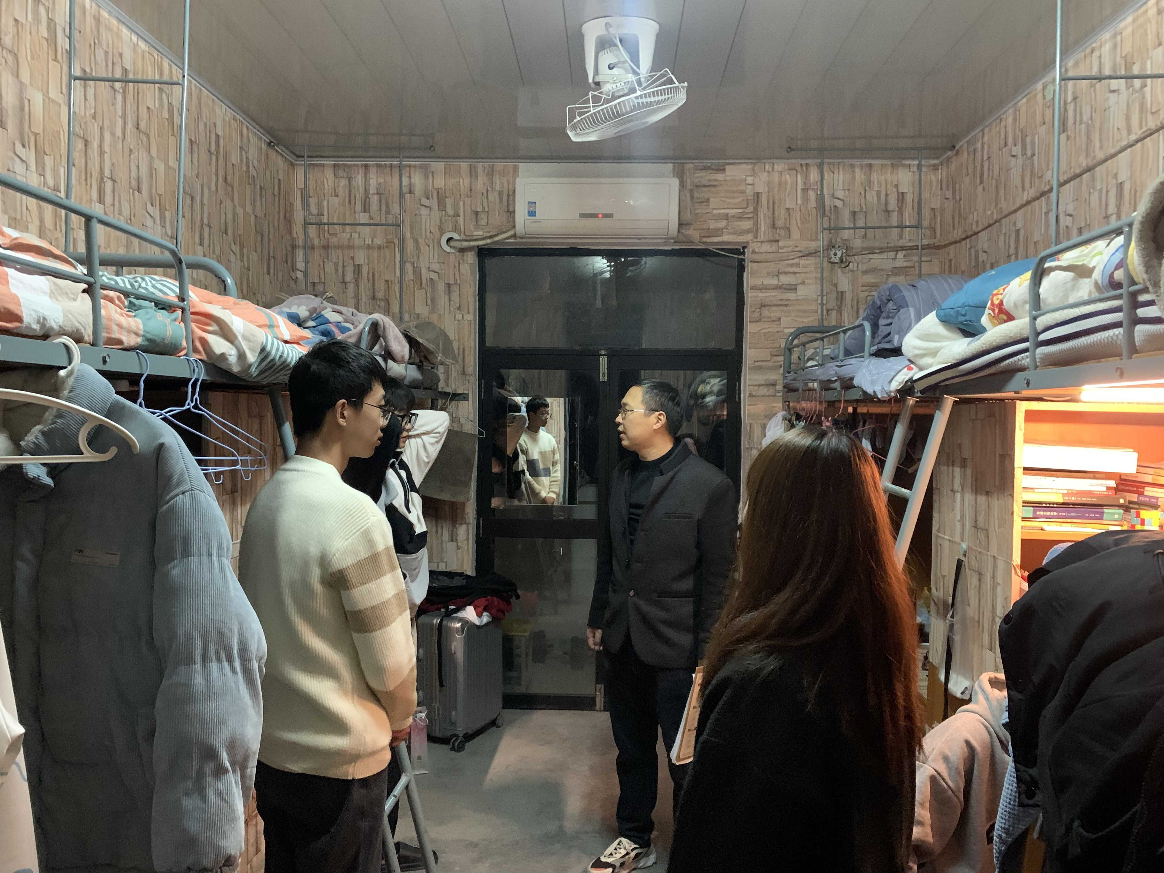走访过程中,万志兵副书记重点对使用违章电器、违规经商、私养宠物、私拉电线、私自外宿、抽烟等安全隐患问题进行了逐一排查。安全隐患排查的同时,万志兵副书记还与同学们进行了亲切的交谈,了解他们的学习和生活情况,听取他们对于学校学生宿舍管理工作的意见和建议,叮嘱他们加强安全防范和卫生意识,自觉遵守学校规章制度。辅导员们也进行了现场指正,对存在安全隐患的宿舍进行登记,提出整改建议,提醒同学们禁止在宿舍使用违禁物品。