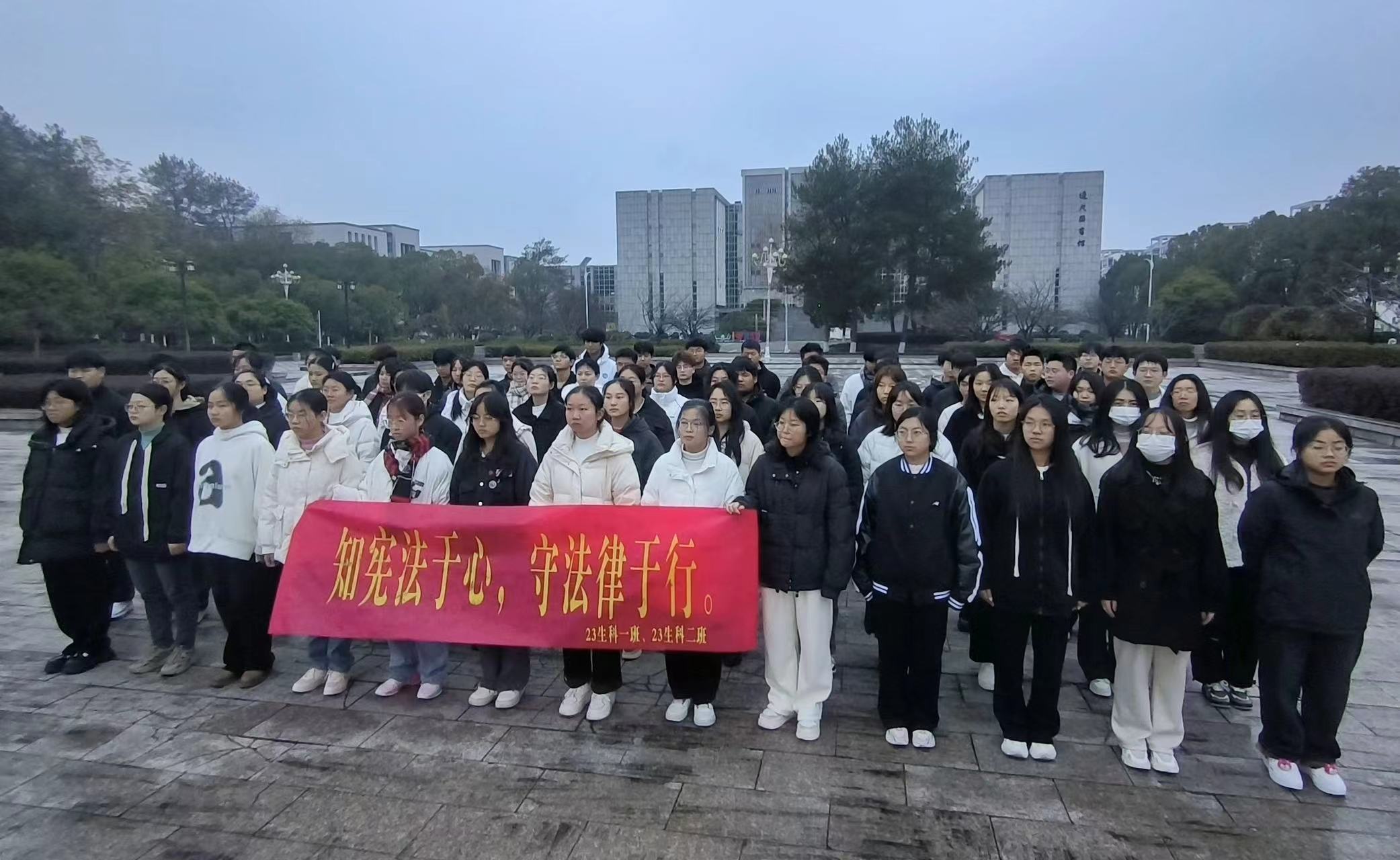 今年12月4日是我国第十个“国家宪法日”,也是全国法制宣传日。为认真学习贯彻习近平法治思想,进一步增强学生的宪法意识和法治观念,推动校园形成弘扬宪法精神,维护宪法权威的良好氛围,12月4日上午,太阳成集团tyc7111在喷泉广场举行升国旗仪式暨“12.4国家宪法日”主题活动。太阳成集团tyc7111党委副书记万志兵、专职辅导员方芳、2023级生物科学专业新生参加了此次升旗仪式。