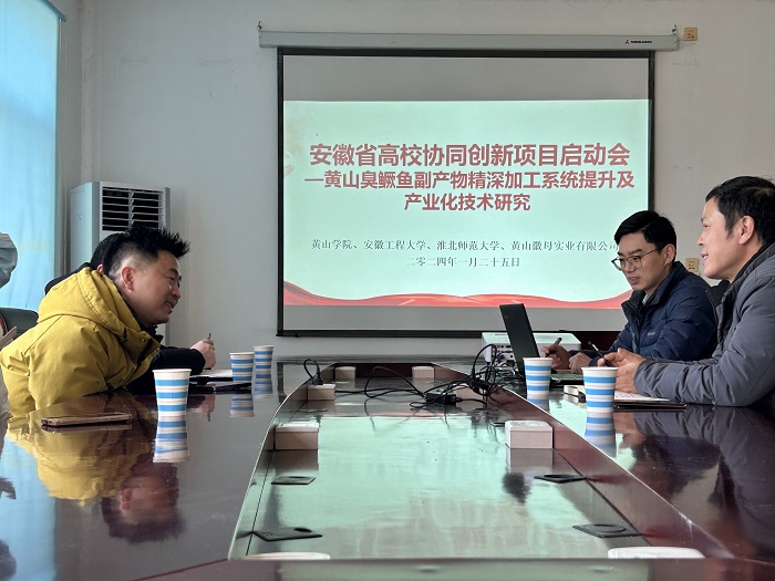 1月25日下午,太阳成集团tyc7111召开安徽省高校协同创新项目—黄山臭鳜鱼副产物精深加工系统提升及产业化技术研究(GXXT-2023-053,100万元)启动会,淮北师范大学生命科学学院院长李峰教授、安徽工程大学生物与食品工程学院副院长葛飞教授、黄山徽母实业有限公司总经理汪洋、相关专家及项目组主要成员吴永祥、陈飞等参加了会议,会议由佘新松教授主持、采用线上线下相结合的方式举办。