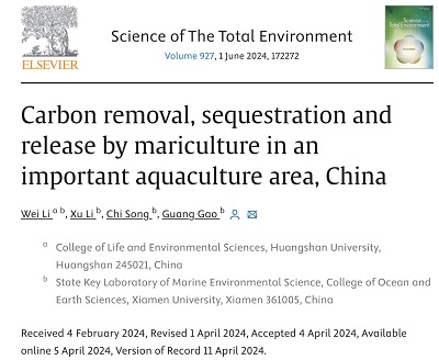 近日,我院李伟博士与厦门大学近海海洋环境科学国家重点实验室、海洋与地球学院高光副教授课题组合作,在环境科学与生态学领域权威Top期刊《Science of the Total Environment》(中科院1区,影响因子9.8)在线发表了题为“Carbon removal, sequestration and release by mariculture in an important aquaculture area, China”的科研论文。