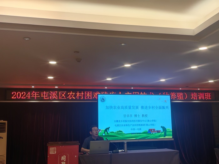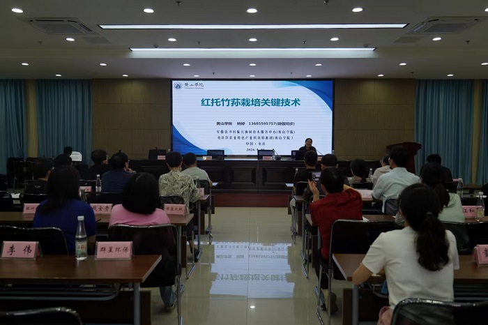 5月27-28日,甘卓亭教授、姚婷教授以《加快农业高质量发展、推进乡村全面振兴》、《羊肚菌大田种植技术交流》向屯溪区农村困难残疾人实用技术(种养殖)培训班学员进行专题培训,并围绕高值食用菌栽培技术方面进行了深入交流。5月30日,姚婷教授赴屯溪区九龙园区服务中心以《红托竹荪栽培关键技术》开展培训活动,对红托竹荪栽培技术、管理方法及其病虫害防治等方面进行了详细讲解,并与科技人员交流互动。此次活动累计培训150余人次。