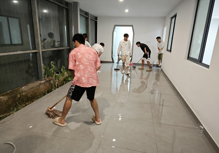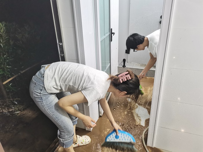 20日晚降雨渐停,随着洪水退去,园林专业工程实训场馆内出现了大量淤泥。21级园林专业班委抓住时机,闻“汛”而动,迅速成立应急队,组织广大学生党员、积极分子以及各实训小组组组长开展灾后清理工作。应急队成员携带工具对地面、墙面的淤泥进行冲刷,并将积水排净,然后对基地内的卫生进行了全方位的打扫,最终在同学们的努力下使基地恢复了干净、整洁、畅通的状态。