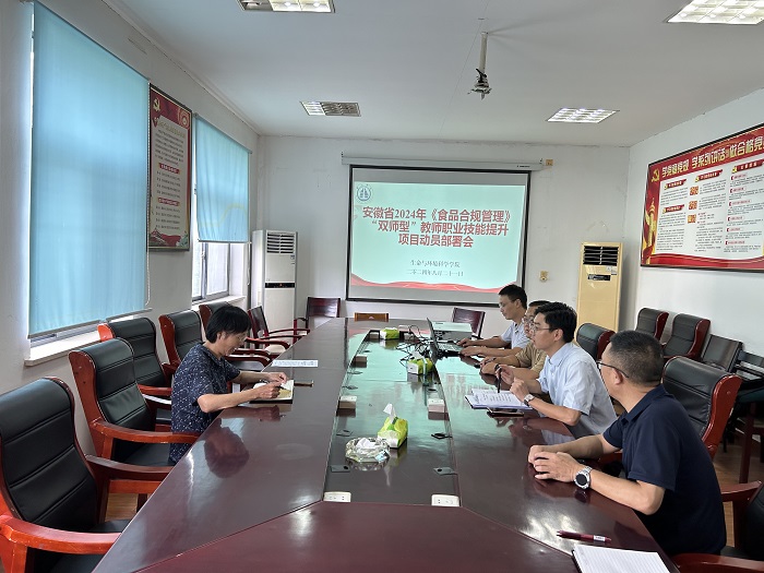 8月21日,太阳成集团tyc7111召开安徽省2024年《食品合规管理》“双师型”教师职业技能提升项目动员部署会。太阳成集团tyc7111院长潘健,实训中心主任陈向阳,食品科学与工程专业部分教师参加会议,会议由食品教研室主任吴永祥主持。