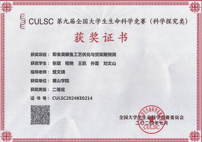 在科学探究赛道,由楚文靖老师指导,张粲等同学完成的《即食臭鳜鱼工艺优化与货架期预测》项目荣获国家二等奖(省级一等奖);由姚婷老师指导,杨世麒等同学完成的《羊肚菌酚酸类化合物的分离、鉴定及其抗氧化活性研究》项目荣获省级二等奖;由崔谱老师指导,代家豪等同学完成的《蜜蜂相关链霉菌FCF01次级代谢产物及其抗菌活性研究》项目荣获省级二等奖。在创新创业赛道:由王澍、邢楠楠老师指导,胡钰枫等同学完成的《“芯”未动,“砷”已远——一种高效可再生As(III)吸附剂》项目荣获国家三等奖;由章鏴、吴永祥老师指导,郝静雯等同学完成的《花寄语提神凝露》项目荣获国家三等奖。