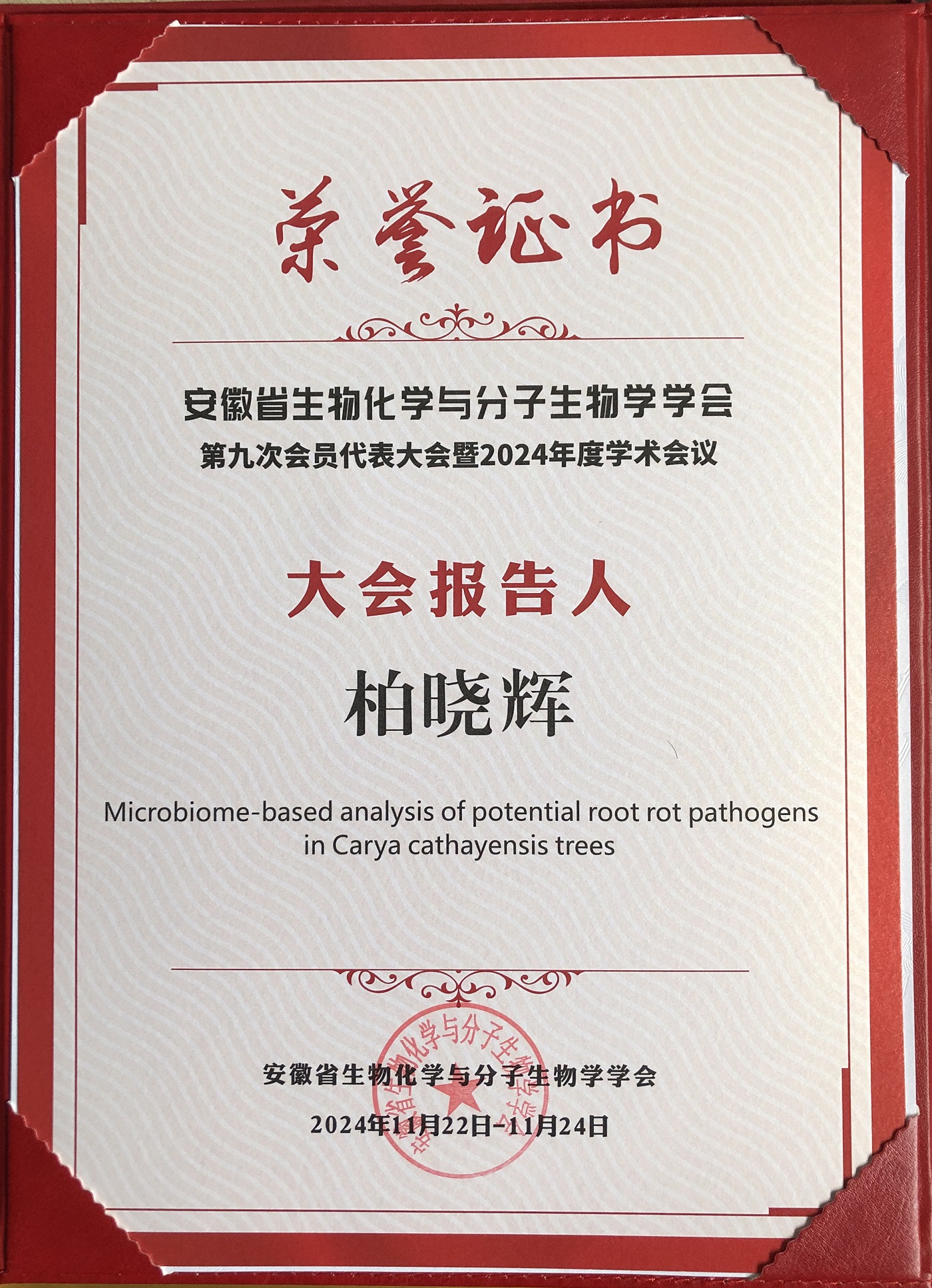 本次大会围绕生物化学与分子生物学在经济建设和大健康领域的最新研究成果进行深入探讨与交流。柏晓辉教授在大会上作题为《Microbiome-based analysis of potential root rot pathogens in Carya cathayensis trees》的学术报告。山核桃产业在安徽省国民经济中扮演着重要角色,不仅提升了当地农民的生活水平,还带动了相关产业的发展,成为推动乡村振兴的重要力量。但根腐病作为山核桃树近年来新发的一种病害,已给山核桃产业带来毁灭性打击,可是造成山核桃树根腐病的病因不明,柏晓辉团队从山核桃树林地土壤成分、根部微生物组学分析等角度探究造成根腐病的潜在病原菌,并指导果农利用生态治理方式进行山核桃树根腐病防治,报告受到与会专家、学者的高度评价。
