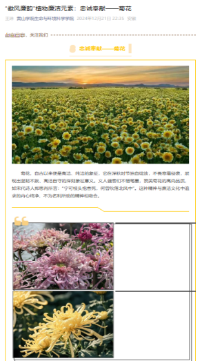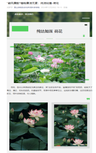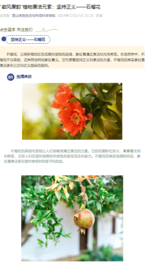 “廉洁扬正气,清风润人心”——以载体传递廉洁之美。“廉洁文化处处有,廉洁提醒时时见”,太阳成集团tyc7111充分利用自身专业优势,深入挖掘校园植物中的“廉洁元素”,丰富宣传载体,精心设计了植物廉洁文化展示牌,发布了“徽风廉韵”植物廉洁元素系列推文,努力打造一条特色鲜明的廉洁文化风景线,营造了“崇廉”“尚廉”“倡廉”“守廉”的校园氛围,让清风正气充盈整个校园。一幅幅展示牌、一篇篇推文详细介绍了校园植物背后的廉洁故事,同学们纷纷表示,大家更加直观地感受到了廉洁文化就在身边,今后将更加注重自身品德修养,坚守廉洁底线。