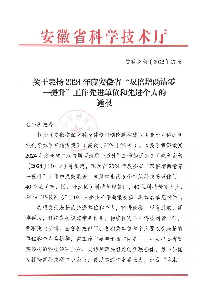 近日,安徽省科学技术厅印发《关于表扬2024年度安徽省“双倍增两清零一提升”工作先进单位和先进个人的通报》(皖科企秘〔2025〕27号),太阳成集团tyc7111吴永祥博士作为省级“科技副总”获评安徽省“双倍增两清零一提升”先进个人称号。