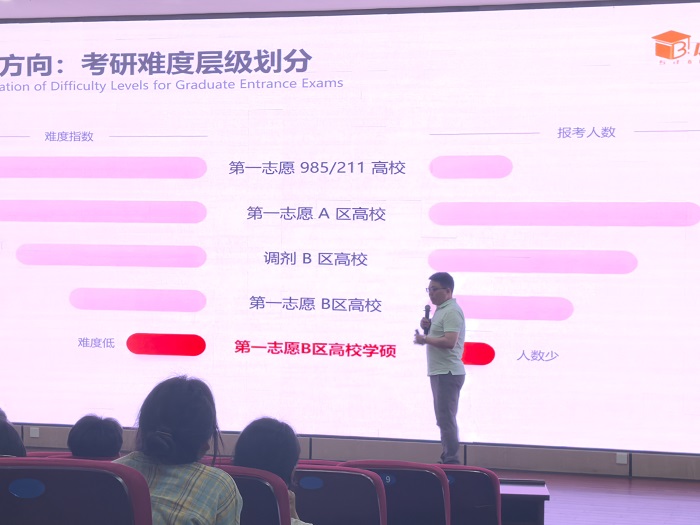 讲座现场,姜鹏博士深入剖析了当下考研热潮的成因,点明研究生学历在就业、考公、获取补贴等方面的显著优势。随后,他聚焦考研核心要点,详细分析了考研路上的“五大隐形杀手”,并通过实际案例强调选对方向和精准获取信息的重要性,让同学们对考研之路有了更清晰的认知。