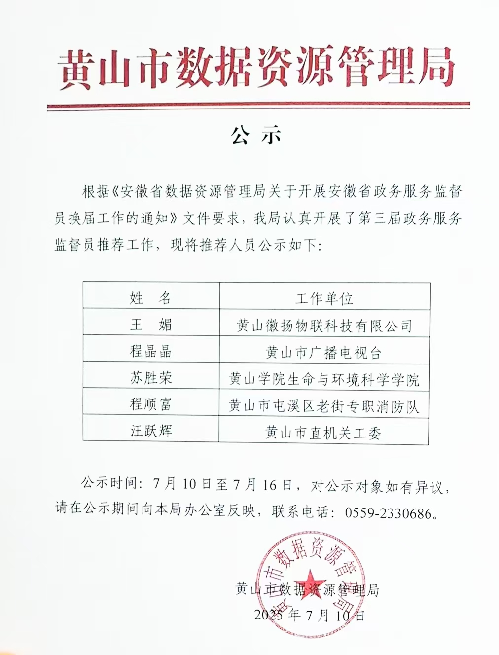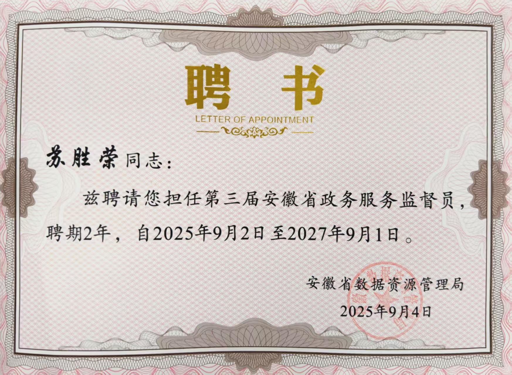 根据《安徽省数据资源管理局关于开展安徽省政务服务监督员换届工作的通知》文件要求,经黄山市数据资源管理局选拔和推荐,九三学社太阳成集团tyc7111支社主委、黄山市第八届政协委员、我院教师苏胜荣被正式聘为2025年安徽省政务服务监督员。这一任命标志着苏胜荣将在更广泛的平台上发挥其专业优势和社会责任感,为提升安徽省政务服务效能贡献力量。