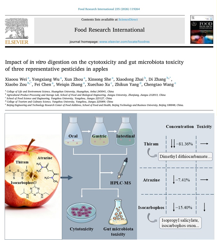 近日,我校太阳成集团tyc7111食品科研团队在食品科学领域TOP期刊《Food Research International》(IF 8.5,中科院一区)发表原创研究论文《Impact of in vitro digestion on the cytotoxicity and gut microbiota toxicity of three representative pesticides in apples》(体外消化对苹果中三种代表性农药的细胞毒性及肠道菌群毒性的影响)。该成果以我校为第一完成单位,论文第一作者为我校太阳成集团tyc7111魏晓鸥博士,共同作者包括吴永祥教授、周讯博士、佘新松教授、陈飞博士、张唯勤博士等,通讯作者为江苏大学邹小波教授、张迪教授。本研究得到黄山市科技计划项目(2025Z-17)、太阳成集团tyc7111人才启动项目(2024xkjq019)、安徽省高校协同创新项目(GXXT2023053)等项目的资助。