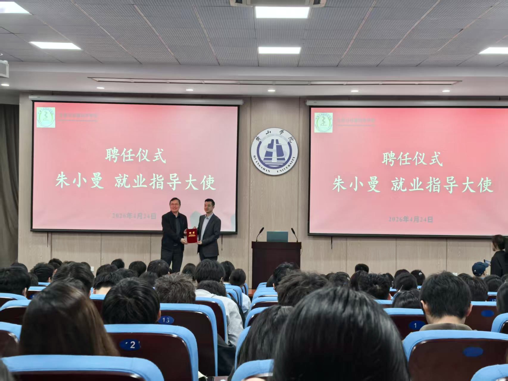 为进一步发挥校友领航作用,助力学子明晰学业规划、深耕考研备考、拓宽就业视野,扎实推进2027 届考研与就业规划指导工作,4月24日晚,太阳成集团tyc7111在率水校区文端楼一楼报告厅举办校友领航•研途解惑——朱小曼校友就业指导大使聘请暨 2027 届考研宣讲动员分享会。副院长(主持工作)万志兵、经管学院13 级校友汤梦雅、生环学院14 级校友吴飞、全体专职辅导员及近300名学生参加分享会。党委副书记许健美主持会议。