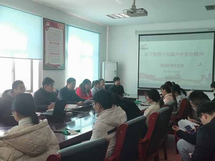 11月23日,食品环境党支部于天都园林三楼会议室召开党史专题学习会议,传达学习贯彻党的十九届六中全会精神。支部书记徐良玉、副书记王秋阳、组宣委员罗毅、纪检委员吴丽萍以及52名党员参加会议。会议由罗毅主持。