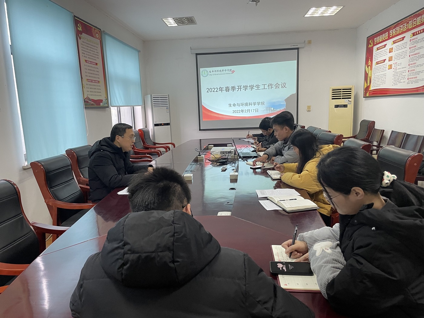 为确保学生顺利返校及各项学生工作正常有序地开展,2月17日下午,生环学院在天都园林三楼会议室召开2022年春季开学学生工作会议。全体专、兼职辅导员参加会议,会议由院党委副书记万志兵主持。