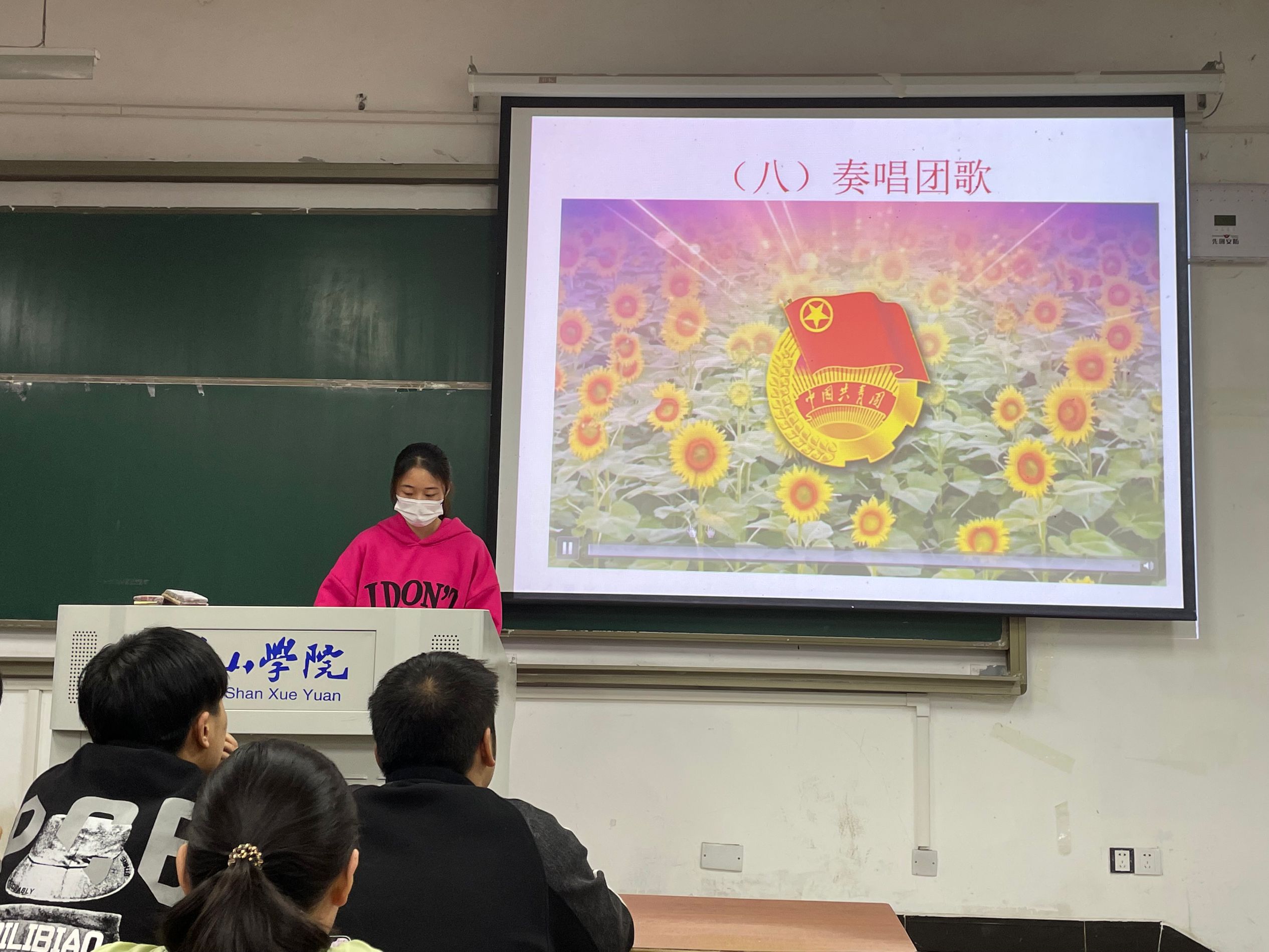 活动在各位学生的满怀期待下开始,首先张辰佳给予新团员王井侠热烈的祝贺,之后全体学生起立奏唱国歌,并为新团员颁发团徽。活动期间,新团员在团支书的带领下宣读入团誓言,组织委员黄靖媛宣读团章中有关团员义务和权利的条款,紧接着新团员和老团员代表发言,团员是一种象征,更是一份责任,要知道入团不只是形式,团徽也不只是标志,而是推动自身今后学习的动力。仪式最后全体学生起立奏唱团歌,每个学生脸上都展现出追随团组织的坚定面孔。