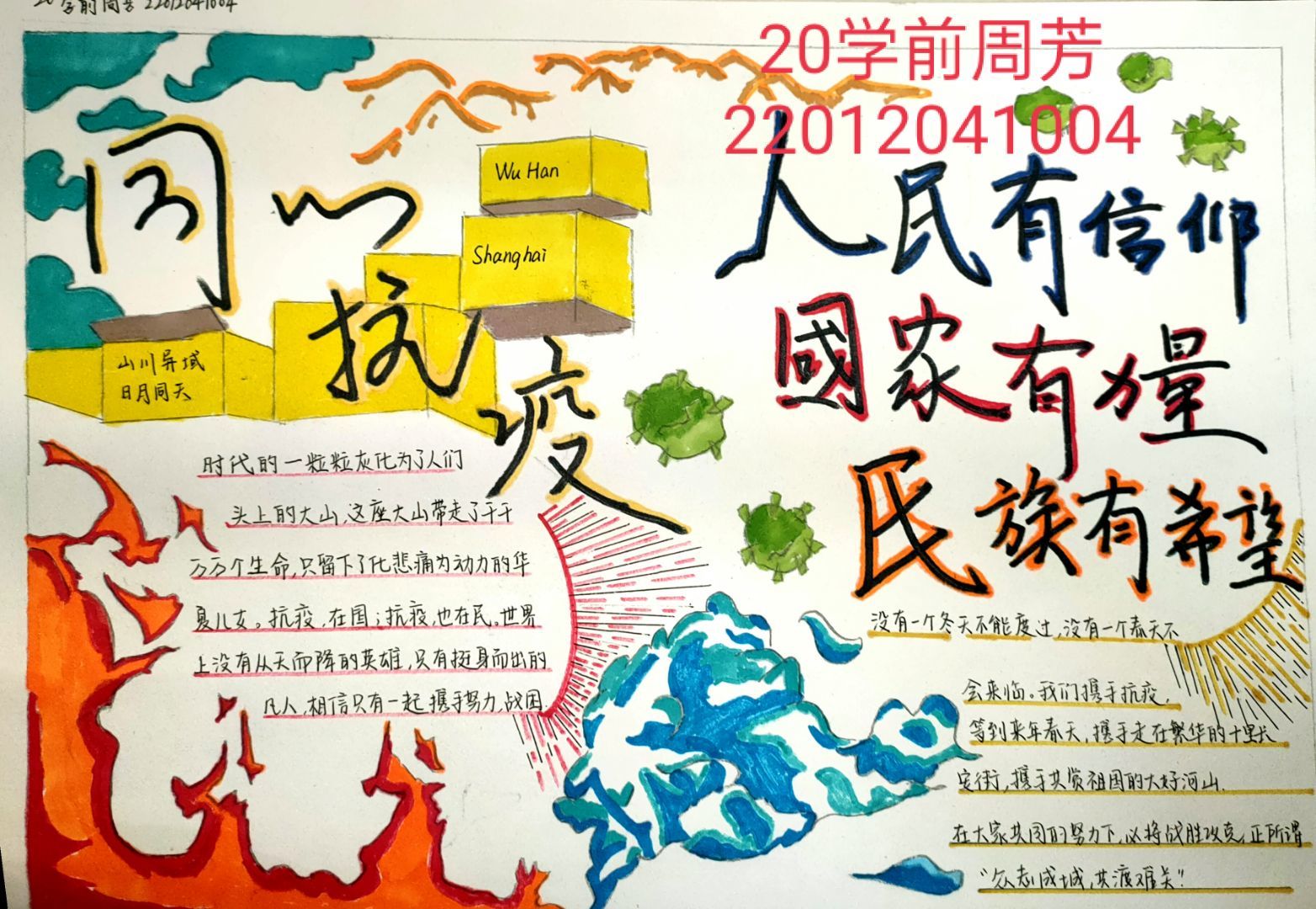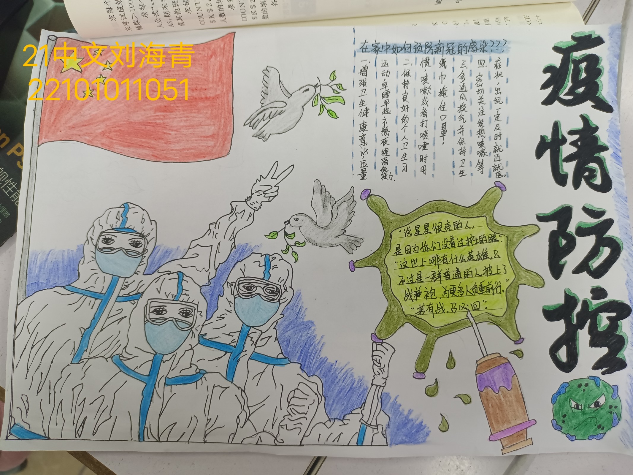 在此次活动中,同学们围绕着“抗击病毒,防疫有我”主题精心准备,积极参与。活动要求,手抄报内容丰富多彩,图画排版与文字相结合,展现同学们抗击疫情的决心。同学们手绘出作品后,将其上传至群相册。最后由工作人员评选出优秀作品并发放相应的学分。