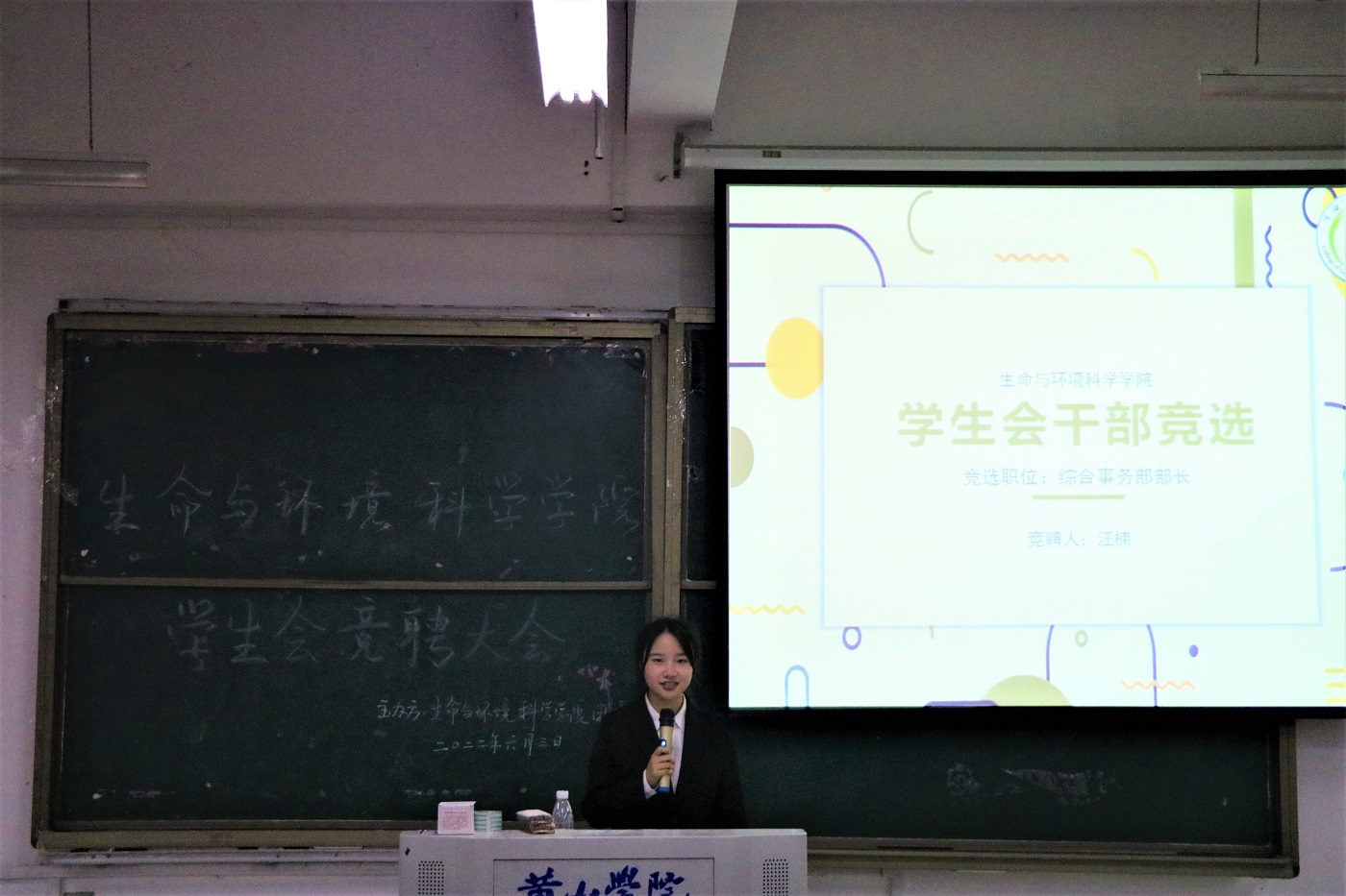 竞选开始,候选人逐一上台进行PPT讲演,每一位候选人都从“自我介绍”、“个人表现”、“岗位理解”、“未来工作设想”四个方面展示自己,充分表达了自己对于团委学生会的认识以及无论是否当选都会保持初心、继续为太阳成集团tyc7111服务。