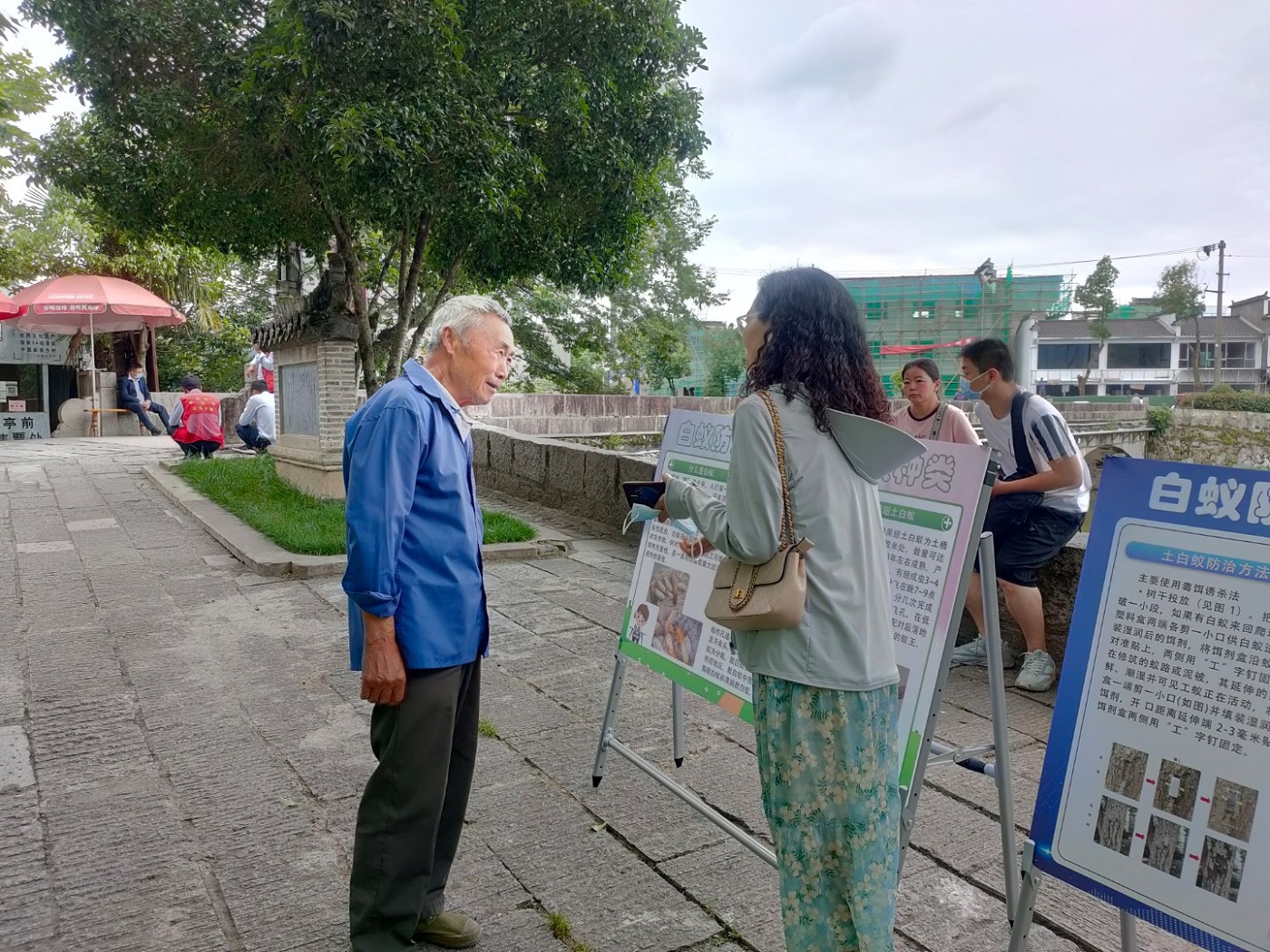 实践团队进行实地调查,了解白蚁聚集的具体情况,结合生态环境遭白蚁破坏后形成的影响进行知识宣讲,引起社区居民对白蚁防治的重视,与此同时,团队成员分发宣传手册和调查问卷、积极主动帮助村民预防治理。
