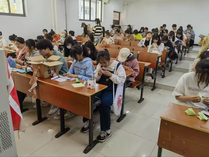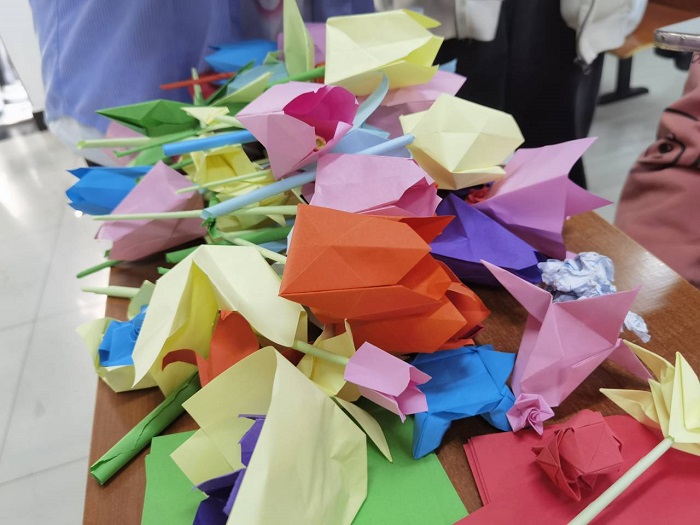 活动期间,同学们自行利用协会准备的纸张和其他所需工具,跟随教学视频或工作人员的现场教学,充分发挥自己的想象力和技巧,用纸折出不同的花朵。学生既可以与工作人员交流不同花的折法,并将花赠与工作人员,也可以将花自行带回。