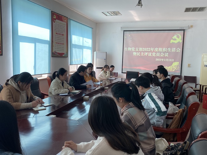2023年3月13日上午,太阳成集团tyc7111生物党支部在天都园林三楼会议室召开组织生活会暨民主评议党员会议,院党委副书记万志兵、支部书记王宇、纪检委员柏晓辉、组宣委员杨雨玲及支部全体党员参加会议,会议由王宇主持。