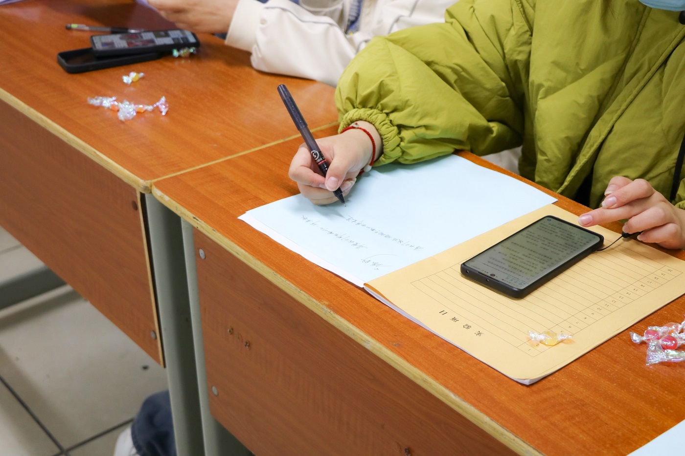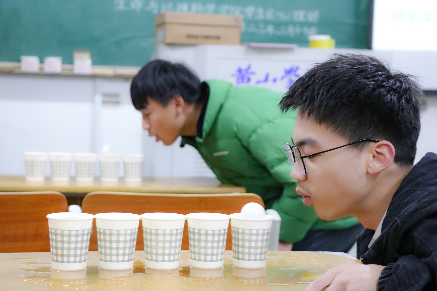 设置四组比赛,每组邀请四位同学。首先准备有五个装满水的纸杯,第一个纸杯放有一个乒乓球。参赛者需将乒乓球从第一个纸杯依次吹到最后一个纸杯,率先完成者获胜。