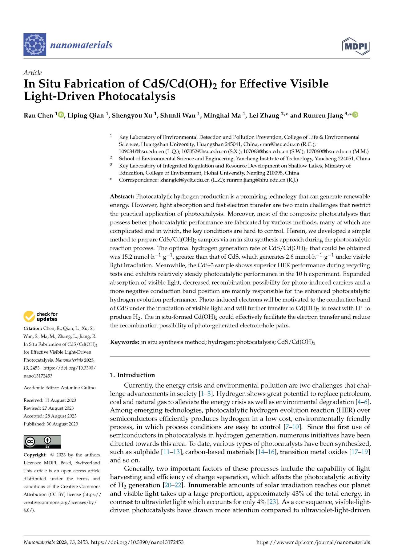 自2022年以来,我院陈然博士以第一作者/通讯作者在《Transactions of Tianjin University》(IF=7.1)、《International Journal of Hydrogen Energy》(IF=7.2)、《Chemosphere》(IF=8.8)等期刊上连续发表论文10余篇,主要涉及新污染物治理和能源再生方面的基础前沿成果。如以抗生素和农药为目标,针对其在治理过程中出现的选择性吸附低、降解缓慢等难题开展研究。系统分析了污染物在分子水平上的迁移和转变机制,并提出了治理措施,为新污染物的高效去除提供了参考和实验依据;以水分解为目标,探索氢能的再生利用。实验发现水分子在光或电的驱动下,存在氢气产生缓慢、难以有效脱附等问题,针对性的提出调整策略,提高氢能再生的效率。该研究有助于进一步理解水分解产氢的过程并为其开发和利用提供借鉴和理论启发。