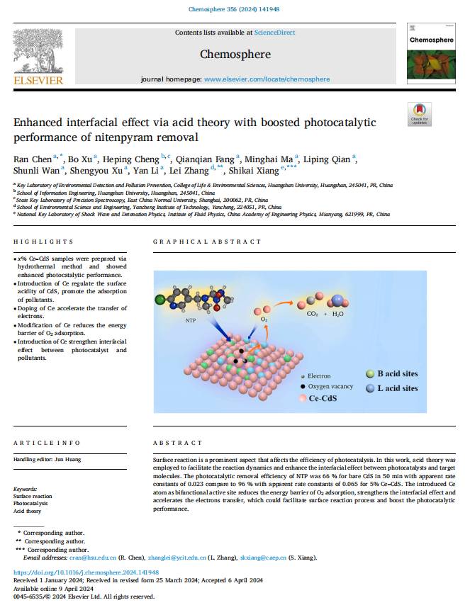 此外,陈然博士积极吸纳大学生加入自己的科研项目,致力培养学生的创新能力,指导2021级环境科学专业本科生徐波以第二作者身份在SCI期刊《Chemosphere》发表题为《Enhanced interfacial effect via acid theory with boosted photocatalytic performance of nitenpyram removal》的研究论文,指导2021级环境科学专业本科生王荣利申请专利一项《一种基于电磁发电的噪声发电系统及控制方法》。