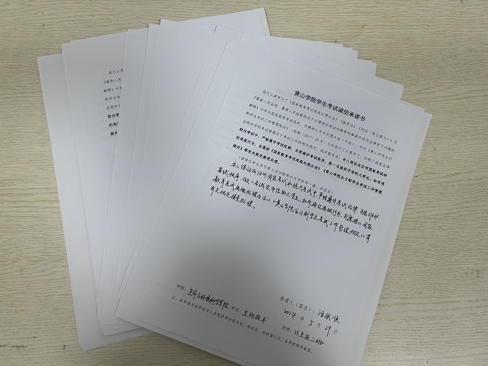 最后,同学们纷纷书写《太阳成集团tyc7111学生考试诚信承诺书》,并宣誓“在任何国家考试和校内考试中,严格遵守考试纪律,自觉维护考试秩序,做一名诚实守信的大学生。”,表明了同学们对于诚信考试、严守考纪的决心。