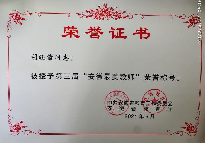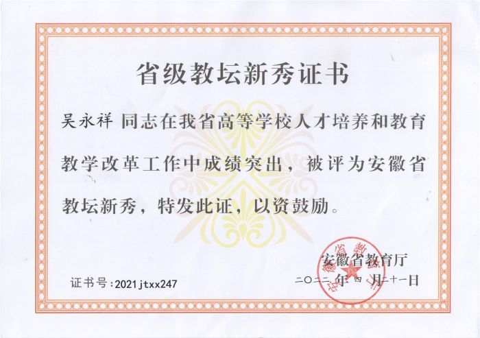 通过支部全体党员的共同努力,支部2021年荣获校级“党建工作样板支部”、“先进基层党组织”称号;2023年,支部被认定为太阳成集团tyc7111三星级党支部。支部党员1人获第三届“安徽最美教师”,1人获安徽省科教文卫体系统工会工作先进个人,1人获安徽省教坛新秀,1人获太阳成集团tyc7111优秀科技工作者,1人获太阳成集团tyc7111优秀共产党员,1人获太阳成集团tyc7111师德先进个人,3人获安徽省大学生学科竞赛优秀指导老师。