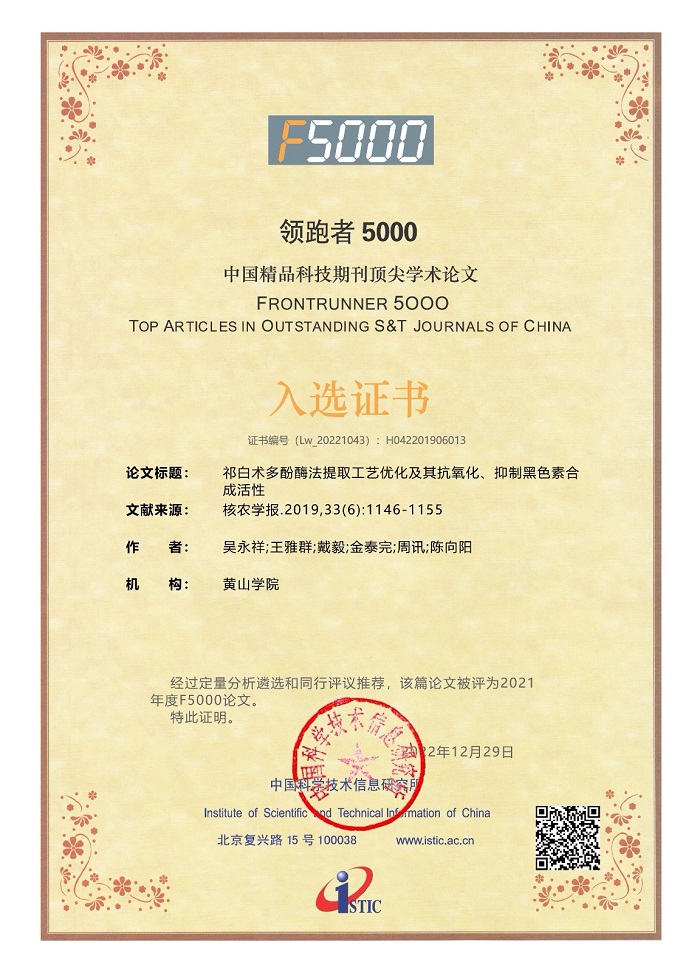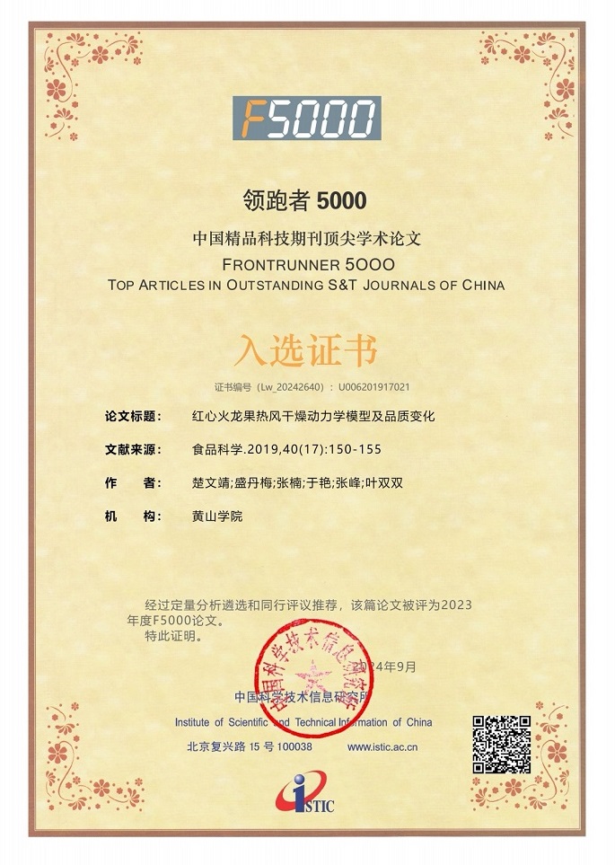近日,中国科学技术信息研究所发布了2023年度“领跑者5000--中国精品科技期刊顶尖学术论文(F5000)”入选名单,太阳成集团tyc7111楚文靖博士指导的食品科学与工程专业本科生发表在《食品科学》(2019年40卷第17期)期刊上的论文“红心火龙果热风干燥动力学模型及品质变化”,以及吴永祥博士指导的食品科学与工程专业本科生发表在《核农学报》(2019年33卷第6期)期刊上的论文“祁白术多酚酶法提取工艺优化及其抗氧化、抑制黑色素合成活性”等两篇文章成功入选。